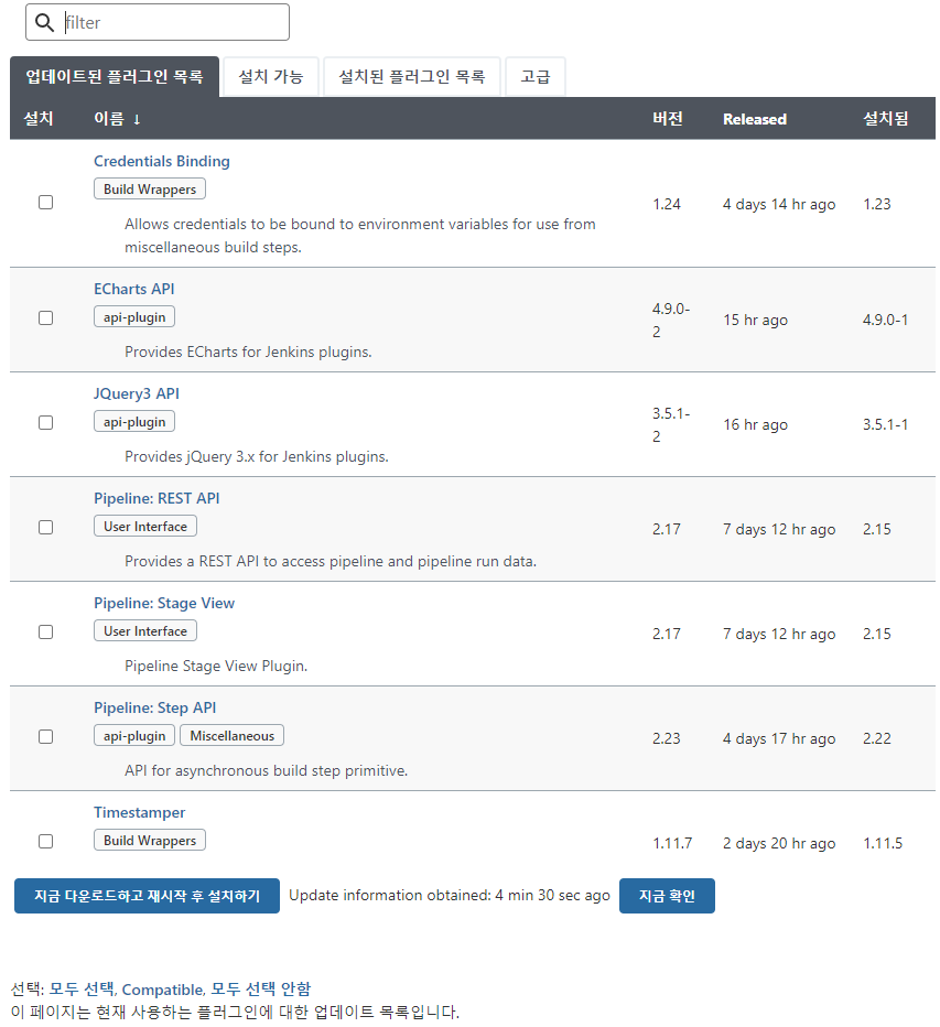 - 업데이트된 플러그인 목록 젠킨스 플러그인 업데이트