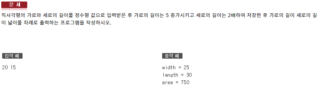 #include <iostream> using namespace std; int main(void) { int width, length; cin >> width >> length; width += 5; length *= 2; int area = width * length; cout << "width = " << width << endl; cout << "length = " << length << endl; cout << "area = " << area << endl; }114 : 연산자 - 형성평가4
