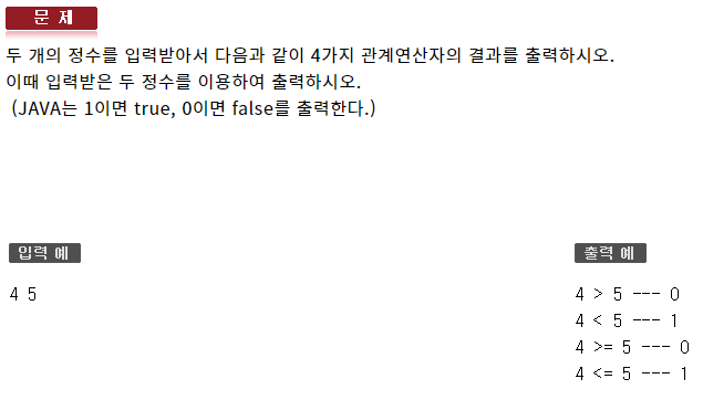 #include <iostream> using namespace std; int main(void) { int var1, var2; cin >> var1 >> var2; cout << (var1 == var2) << endl; cout << (var1 != var2) << endl; }삼항 연산자를 이용해 정수로 출력하는 코드는 이하와 같습니다.