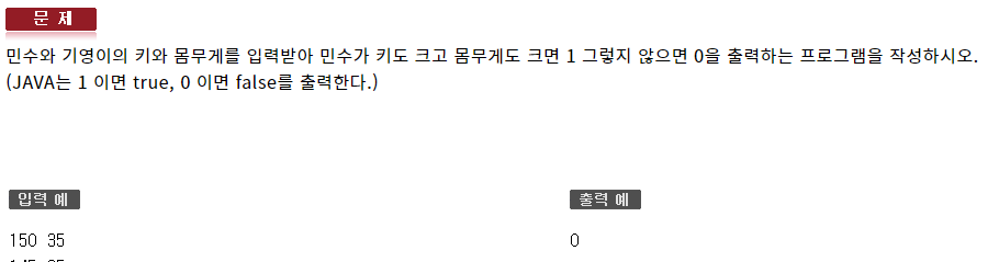 #include <iostream> using namespace std; int main(void) { int var1, var2, var3; cin >> var1 >> var2 >> var3; bool isFirstBiggest = (var1 > var2) && (var1 > var3); bool isAllSame = (var1 == var2) && (var2 == var3); cout << isFirstBiggest << ' ' << isAllSame << endl; }111 : 연산자 - 형성평가1