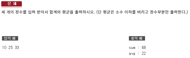 #include <iostream> using namespace std; int main(void) { int var1, var2, var3; cin >> var1 >> var2 >> var3; int sum = var1 + var2 + var3; int avg = sum / 3; cout << "sum : " << sum << endl; cout << "avg : " << avg << endl; }519 : 연산자 - 자가진단2