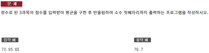 #include <iostream> using namespace std; int main(void) { int var1, var2, var3; cin >> var1 >> var2 >> var3; int sum = var1 + var2 + var3; // 소수점 표시를 위해 실수로 변환 float avg = static_cast<float>(sum) / 3; // 소수점 이하 1자리 출력 cout.setf(ios::fixed); cout.precision(1); cout << avg << endl; }117 : 디버깅 - 형성평가2