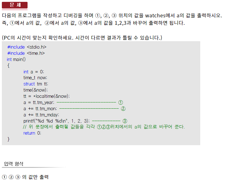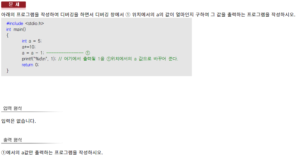 이 문제는 해당 위치에 브레이크 포인트를 걸고 디버깅을 통해 실행하여 브레이킹 포인트에서 a의 값을 확인하라는 의도를 가진 문제입니다.