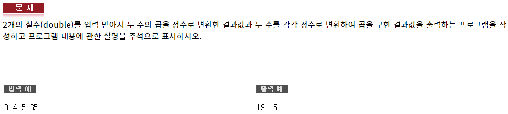 #include <iostream> using namespace std; int main(void) { double var1, var2; // 두개의 값 입력받기 cin >> var1 >> var2; // 곱한 뒤 정수로 변환 int productFirst = static_cast<int>(var1 * var2); // 정수로 변환 후 곱 int castFirst = static_cast<int>(var1) * static_cast<int>(var2); // 결과 출력 cout << productFirst << ' ' << castFirst << endl; }527 : 디버깅 - 자가진단2