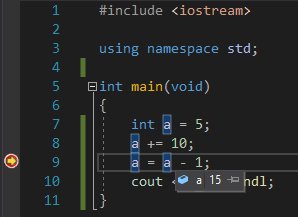 위와 같이 진행해 값을 확인하면 a의 값이 15인 것을 알 수 있습니다.