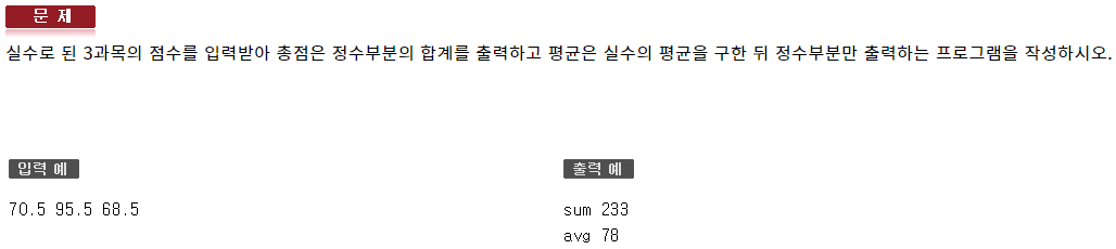#include <iostream> using namespace std; int main(void) { float var1, var2, var3; cin >> var1 >> var2 >> var3; // 정수부분의 합 int sum = static_cast<int>(var1) + static_cast<int>(var2) + static_cast<int>(var3); // 실수의 평균을 구한 뒤 정수로 int avg = static_cast<int>((var1 + var2 + var3) / 3); cout << "sum " << sum << endl; cout << "avg " << avg << endl; }118 : 디버깅 - 형성평가3