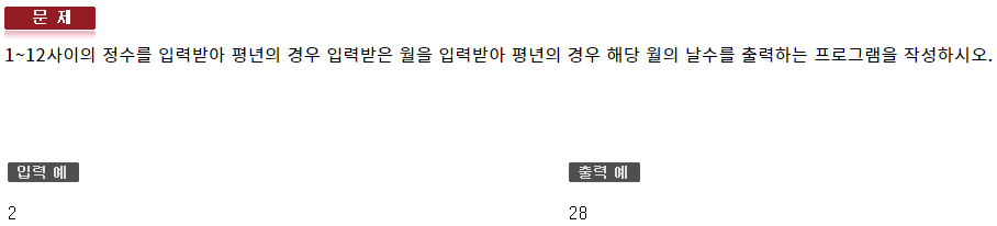 #include <iostream> using namespace std; int main(void) { int month; cin >> month; switch (month) { case 2: cout << 28 << endl; break; case 4: case 6: case 9: case 11: cout << 30 << endl; break; default: cout << 31 << endl; } }배열 사용)