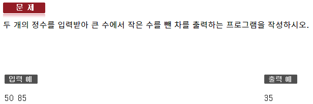 #include <iostream> using namespace std; int main(void) { int var1, var2; cin >> var1 >> var2; int big = var1 > var2 ? var1 : var2; int small = var1 < var2 ? var1 : var2; cout << big - small << endl; }121 : 선택제어문 - 형성평가2