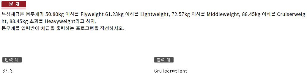 #include <iostream> using namespace std; bool IsFlyweight(float weight); bool IsLightweight(float weight); bool IsMiddleweight(float weight); bool IsCruiserweight(float weight); int main(void) { float weight; cin >> weight; if (IsFlyweight(weight)) { cout << "Flyweight" << endl; } else if (IsLightweight(weight)) { cout << "Lightweight" << endl; } else if (IsMiddleweight(weight)) { cout << "Middleweight" << endl; } else if (IsCruiserweight(weight)) { cout << "Cruiserweight" << endl; } else { cout << "Heavyweight" << endl; } } bool IsFlyweight(float weight) { return weight <= 50.85f; } bool IsLightweight(float weight) { return weight <= 61.23f; } bool IsMiddleweight(float weight) { return weight <= 72.57f; } bool IsCruiserweight(float weight) { return weight <= 88.45f; }532 : 선택제어문 - 자가진단5