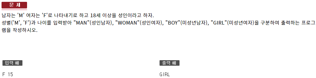 #include <iostream> using namespace std; int main(void) { char sex; int age; cin >> sex >> age; // 남성 if (sex == 'M') { // 성인인지 판단 if (age >= 18) cout << "MAN" << endl; else cout << "BOY" << endl; } // 여성 else { // 성인인지 판단 if (age >= 18) cout << "WOMAN" << endl; else cout << "GIRL" << endl; } }작은 함수 사용)