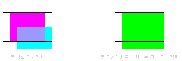 직사각형의 왼쪽 아래의 좌표(x, y)와 오른쪽 위의 좌표(x2, y2)를 저장할 수 있는 구조체 자료형을 만들고 두 개의 직사각형 자료를 입력받아 두 직사각형을 포함하는 최소의 직사각형 자료를 구하여 구조체 변수에 저장하고 출력하는 프로그램을 작성하시오. 단, 모든 입력값은 100을 넘지 않는다.