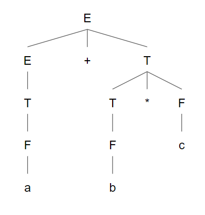 이때, Expression을 E, Term을 T, Factor를 T로 표현하면 a + b * c의 분석 트리를 다음과 같이 표현할 수 있다.