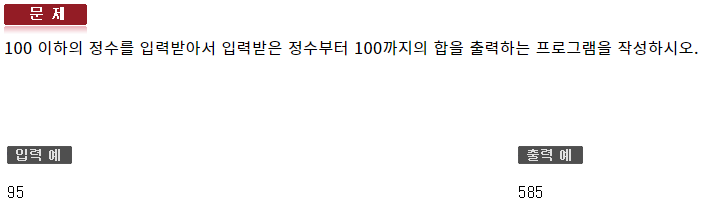 #include <iostream> using namespace std; int main(void) { int var; cin >> var; int sum = 0; for (int i = var; i <= 100; ++i) sum += i; cout << sum << endl; }545 : 반복제어문2 - 자가진단5