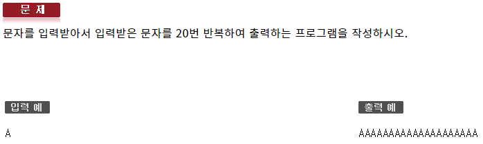 #include <iostream> using namespace std; int main(void) { char ch; cin >> ch; for (int i = 0; i < 20; ++i) cout << ch; cout << endl; }542 : 반복제어문2 - 자가진단2