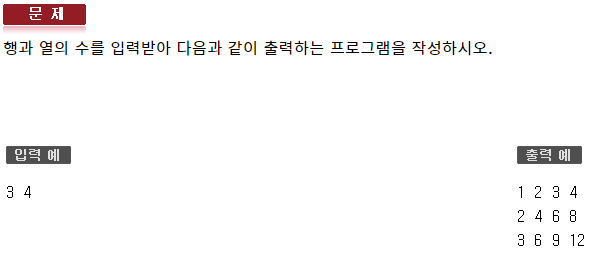 #include <iostream> using namespace std; int main(void) { int height, width; cin >> height >> width; for (int i = 1; i <= height; ++i) { for (int j = 0, num = i; j < width; ++j, num += i) { cout << num << ' '; } cout << endl; } }138 : 반복제어문2 - 형성평가9