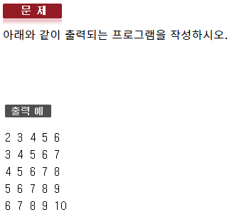 #include <iostream> using namespace std; int main(void) { for (int i = 2; i <= 6; ++i) { for (int j = 0; j <= 4; ++j) { cout << i + j << ' '; } cout << endl; } cout << endl; }548 : 반복제어문2 - 자가진단8