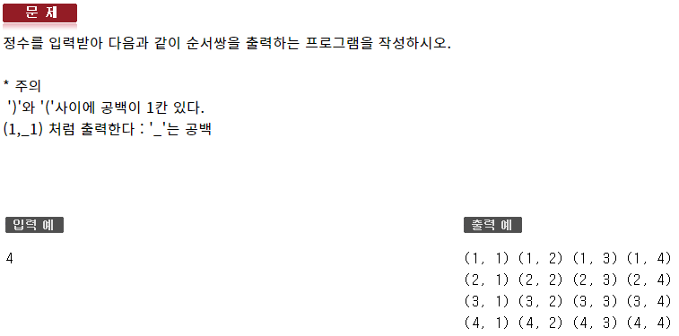 #include <iostream> using namespace std; int main(void) { int var; cin >> var; for (int i = 1; i <= var; ++i) { for (int j = 1; j <= var; ++j) { cout << '(' << i << ", " << j << ") "; } cout << endl; } }139 : 반복제어문2 - 형성평가A