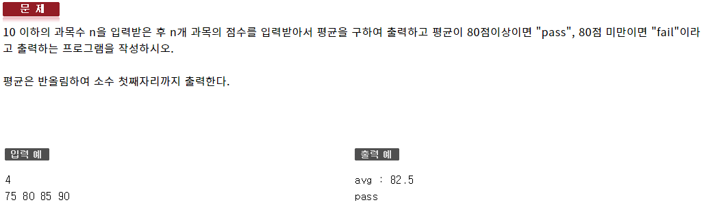 #include <iostream> using namespace std; int main(void) { int lim; cin >> lim; int var, sum = 0; for (int i = 0; i < lim; ++i) { cin >> var; sum += var; } float avg = static_cast<float>(sum) / lim; cout.setf(ios::fixed); cout.precision(1); cout << "avg : " << avg << endl; if (avg >= 80.0f) cout << "pass" << endl; else cout << "fail" << endl; }547 : 반복제어문2 - 자가진단7