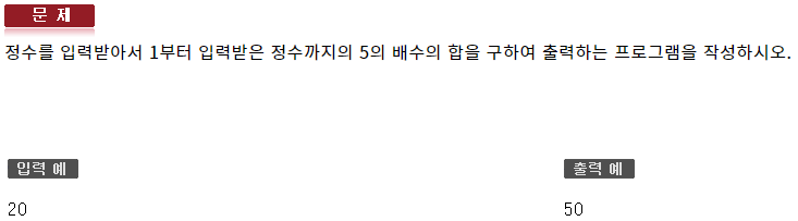 #include <iostream> using namespace std; int main(void) { int var; cin >> var; int sum = 0; for (int i = 5; i <= var; i += 5) { sum += i; } cout << sum << endl; }133 : 반복제어문2 - 형성평가4