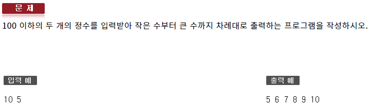 #include <iostream> using namespace std; int main(void) { int var1, var2; cin >> var1 >> var2; int beg = (var1 < var2) ? var1 : var2; int end = (var1 > var2) ? var1 : var2; for (int i = beg; i <= end; ++i) { cout << i << ' '; } cout << endl; }132 : 반복제어문2 - 형성평가3