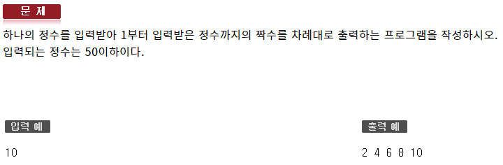 #include <iostream> using namespace std; int main(void) { int var; cin >> var; for (int i = 2; i <= var; i += 2) cout << i << ' '; cout << endl; }544 : 반복제어문2 - 자가진단4