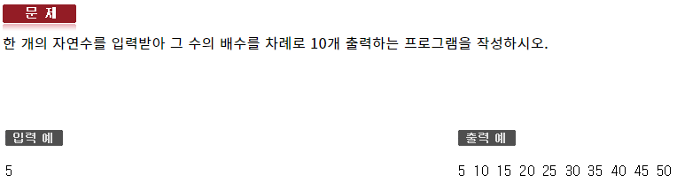 #include <iostream> using namespace std; int main(void) { int var; cin >> var; for (int i = var, count = 0; count < 10; i += var, ++count) { cout << i << ' '; } cout << endl; }137 : 반복제어문2 - 형성평가8