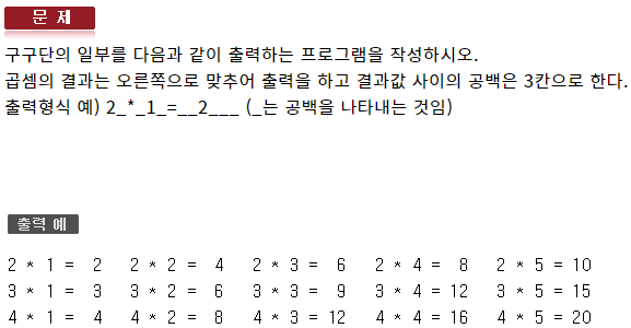 #include <iostream> #include <iomanip> using namespace std; int main(void) { cout.setf(ios::right); for (int i = 2; i <= 4; ++i) { for (int j = 1; j <= 5; ++j) { cout << i << " * " << j << " = " << setw(2) << i * j << " "; } cout << endl; } cout << endl; }130 : 반복제어문2 - 형성평가1