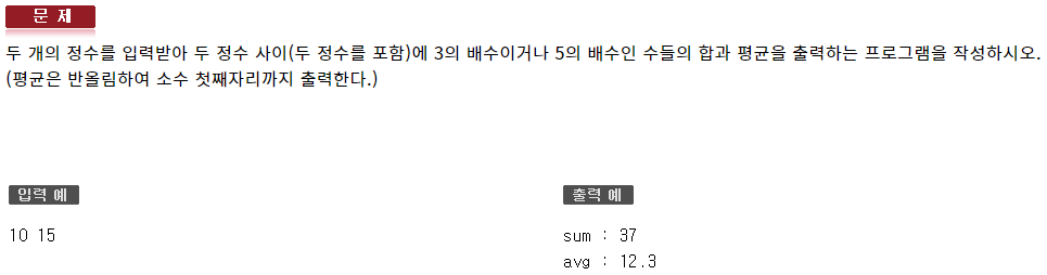 #include <iostream> using namespace std; void Swap(int& var1, int& var2); int main(void) { int var1, var2; cin >> var1 >> var2; if (var1 > var2) Swap(var1, var2); int sum = 0, count = 0; for (int i = var1; i <= var2; ++i) { if (i % 3 == 0 || i % 5 == 0) { sum += i; count++; } } float avg = static_cast<float>(sum) / count; cout.setf(ios::fixed); cout.precision(1); cout << "sum : " << sum << endl; cout << "avg : " << avg << endl; } void Swap(int& var1, int& var2) { int temp = var1; var1 = var2; var2 = temp; }136 : 반복제어문2 - 형성평가7