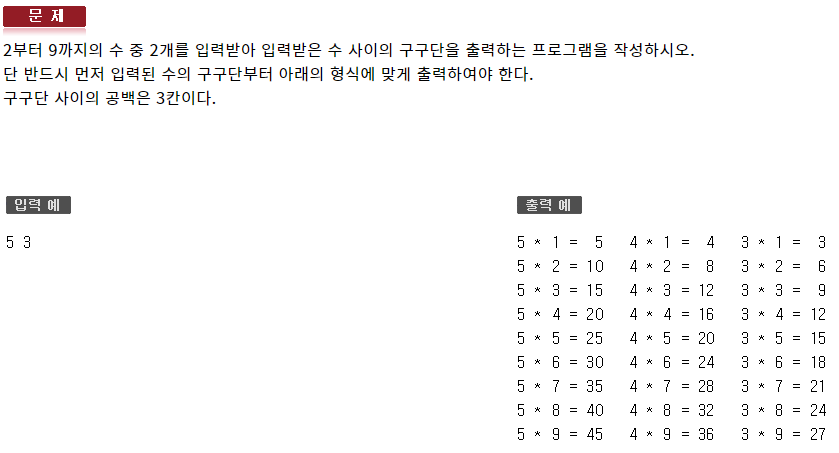 #include <iostream> #include <iomanip> using namespace std; int main(void) { int var1, var2; cin >> var1 >> var2; for (int i = 1; i <= 9; ++i) { if (var1 < var2) { for (int j = var1; j <= var2; ++j) { cout << j << " * " << i << " = " << setw(2) << j * i << " "; } } else { for (int j = var1; j >= var2; --j) { cout << j << " * " << i << " = " << setw(2) << j * i << " "; } } cout << endl; } }http://www.jungol.co.kr/bbs/board.php?bo_table=pbank&sca=1070