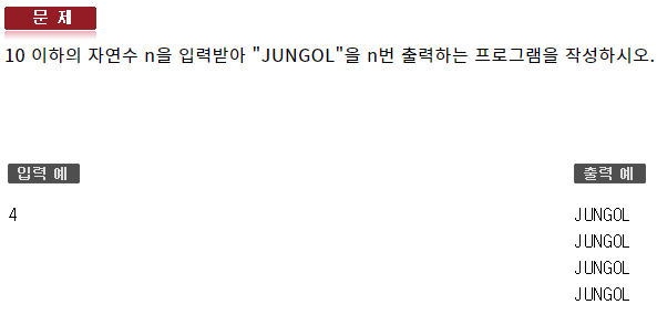 #include <iostream> using namespace std; int main(void) { int n; cin >> n; for (int i = 0; i < n; ++i) { cout << "JUNGOL" << endl; } }131 : 반복제어문2 - 형성평가2