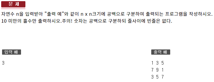 #include <iostream> using namespace std; int main(void) { int n; cin >> n; int num = 1; for (int i = 0; i < n; ++i) { for (int j = 0; j < n; ++j, num += 2) { cout << num % 10 << ' '; } cout << endl; } }http://www.jungol.co.kr/bbs/board.php?bo_table=pbank&sca=1080
