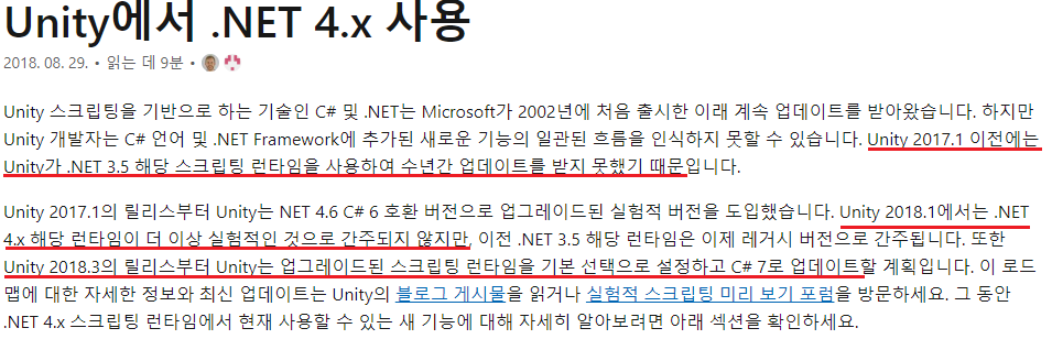 위 정보를 읽어보면 유니티 2017버전 이전에는 NET 4.x 버전을 아예 지원하지 않았고 2017버전에 들어와서 실험적으로 도입하기 시작했다는 것을 알 수 있다.