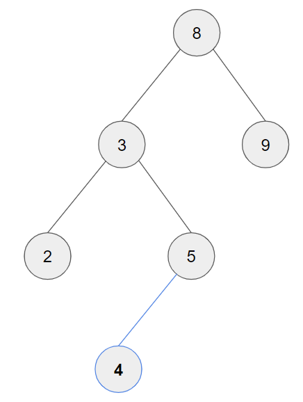 위와 같은 이진 탐색 트리에 4를 삽입하면 다음과 같은 과정을 통해 연산을 수행하게 된다.