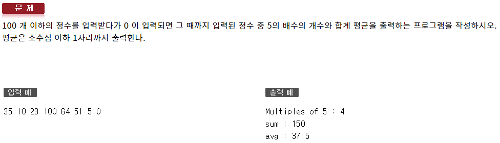 #include <iostream> using namespace std; int main(void) { int arr[100]; int count = 0; for (int i = 0; i < 100; ++i, ++count) { cin >> arr[i]; if (arr[i] == 0) break; } int countMul5 = 0; int sum = 0; for (int i = 0; i < count; ++i) { if (arr[i] % 5 == 0) { countMul5++; sum += arr[i]; } } float avg = static_cast<float>(sum) / countMul5; cout.setf(ios::fixed); cout.precision(1); cout << "Multiples of 5 : " << countMul5 << endl; cout << "sum : " << sum << endl; cout << "avg : " << avg << endl; }158 : 배열1 - 형성평가9