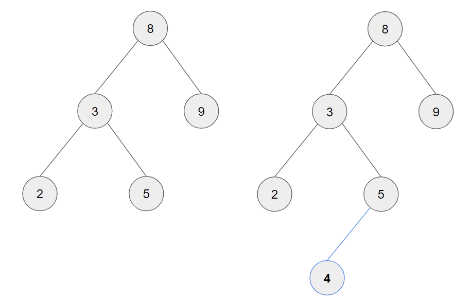 왼쪽 트리에 4를 삽입하면 다음의 과정을 거쳐 오른쪽 트리가 된다.