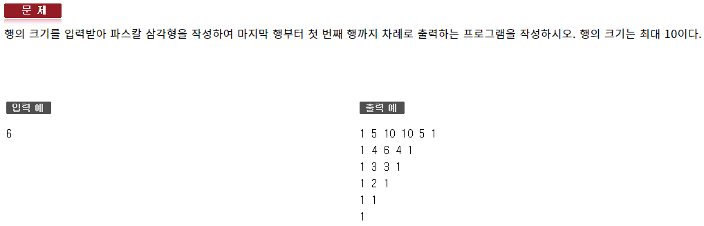 564 : 배열2 - 자가진단1 #include <iostream> using namespace std; bool IsBigAlpha(char ch); int main(void) { int arr[26]{}; char ch; while(true) { cin >> ch; if (!IsBigAlpha(ch)) { break; } arr[ch - 'A']++; } for (int i = 0; i < 26; ++i) { if (arr[i] > 0) cout << static_cast<char>('A' + i) << " : " << arr[i] << endl; } } bool IsBigAlpha(char ch) { if (ch < 'A') return false; if (ch > 'Z') return false; return true; }565 : 배열2 - 자가진단2 #include <iostream> using namespace std; int main(void) { int arr[10]{}; int var; while (true) { cin >> var; if (var == 0) break; arr[var / 10]++; } for (int i = 0; i < 10; ++i) { if (arr[i] != 0) { cout << i << " : " << arr[i] << endl; } } }566 : 배열2 - 자가진단3 사실 이 문제는 배열을 사용하지 않고도 충분히 해결이 가능합니다. #include <iostream> using namespace std; int main(void) { int arr[101]{ 100 }; cin >> arr[1]; cout << arr[0] << ' ' << arr[1] << ' '; for (int i = 2; i < 101; ++i) { arr[i] = arr[i - 2] - arr[i - 1]; cout << arr[i] << ' '; if (arr[i] < 0) break; } cout << endl; }567 : 배열2 - 자가진단4 #include <iostream> #include <iomanip> using namespace std; int main(void) { int arr[3][5]{ 5, 8, 10, 6, 4, 11, 20, 1, 13, 2, 7, 9, 14, 22, 3 }; cout.setf(ios::right); for (int i = 0; i < 3; ++i) { for (int j = 0; j < 5; ++j) { cout << setw(2) << arr[i][j] << " "; } cout << endl; } }568 : 배열2 - 자가진단5 이 문제는 배열 하나만 사용하여 처리가 가능합니다. #include <iostream> using namespace std; int main(void) { int arr[2][4]; cout << "first array" << endl; for (int i = 0; i < 2; ++i) { for (int j = 0; j < 4; ++j) { cin >> arr[i][j]; } } int var; cout << "second array" << endl; for (int i = 0; i < 2; ++i) { for (int j = 0; j < 4; ++j) { cin >> var; arr[i][j] *= var; } } for (int i = 0; i < 2; ++i) { for (int j = 0; j < 4; ++j) { cout << arr[i][j] << ' '; } cout << endl; } }569 : 배열2 - 자가진단6 배열을 조금 더 크게 만들어서 합과 평균을 저장해 입력받는 반복문 내에서 출력까지 할 수 있습니다. #include <iostream> using namespace std; int main(void) { int arr[5][6]; int count = 0; for (int i = 0; i < 5; ++i) { for (int j = 0; j < 4; ++j) { cin >> arr[i][j]; } arr[i][4] = arr[i][0] + arr[i][1] + arr[i][2] + arr[i][3]; arr[i][5] = arr[i][4] / 4; if (arr[i][5] >= 80) { cout << "pass" << endl; count++; } else cout << "fail" << endl; } cout << "Successful : " << count << endl; }570 : 배열2 - 자가진단7 이번 문제는 배열의 경계를 주의하면 쉽게 풀 수 있습니다. #include <iostream> using namespace std; int main(void) { int arr[5][5]{ 1, 1, 1, 1, 1 }; int leftNum; for (int i = 1; i < 5; ++i) { for (int j = 0; j < 5; ++j) { leftNum = (j > 0) ? arr[i][j - 1] : 0; arr[i][j] = leftNum + arr[i - 1][j]; } } for (int i = 0; i < 5; ++i) { for (int j = 0; j < 5; ++j) { cout << arr[i][j] << ' '; } cout << endl; } }160 : 배열2 - 형성평가1 #include <iostream> using namespace std; int main(void) { int arr[7]{}; int var; for (int i = 0; i < 10; ++i) { cin >> var; arr[var]++; } for (int i = 1; i <= 6; ++i) { cout << i << " : " << arr[i] << endl; } }161 : 배열2 - 형성평가2 #include <iostream> using namespace std; int main(void) { int arr[11]{}; int var; for (int i = 0; i < 100; ++i) { cin >> var; if (var == 0) break; arr[var / 10]++; } for (int i = 10; i >= 0; --i) { if (arr[i] != 0) cout << i * 10 << " : " << arr[i] << " person" << endl; } }162 : 배열2 - 형성평가3 #include <iostream> using namespace std; int main(void) { int arr[10]; cin >> arr[0] >> arr[1]; for (int i = 2; i < 10; ++i) { arr[i] = (arr[i - 2] + arr[i - 1]) % 10; } for (int i = 0; i < 10; ++i) { cout << arr[i] << ' '; } cout << endl; }163 : 배열2 - 형성평가4 #include <iostream> using namespace std; int main(void) { int arr[4][3]{ {3, 5, 9}, {2, 11, 5}, {8, 30, 10}, {22, 5, 1} }; int sum = 0; for (int i = 0; i < 4; ++i) { for (int j = 0; j < 3; ++j) { cout << arr[i][j] << ' '; sum += arr[i][j]; } cout << endl; } cout << sum << endl; }164 : 배열2 - 형성평가5 #include <iostream> using namespace std; int main(void) { int arr[4][4]{}; for (int i = 0; i < 4; ++i) { cout << i + 1 << "class? "; for (int j = 0; j < 3; ++j) { cin >> arr[i][j]; arr[i][3] += arr[i][j]; } } for (int i = 0; i < 4; ++i) { cout << i + 1 << "class : " << arr[i][3] << endl; } }165 : 배열2 - 형성평가6 자가진단7과는 다른 방법으로 예외처리를 진행했습니다. 배열에서 해당 부분을 분리해 처리한 것인데요, 이 방법은 값이 정해져 있는 경우에 쓸 수 있으나 값이 변하는 경우(배열의 크기가 바뀌는 경우)에는 사용하기 어렵습니다. #include <iostream> using namespace std; int main(void) { int arr[5][5]{ {1,0,1,0,1} }; for (int i = 1; i < 5; ++i) { // 가장 왼쪽 예외처리 arr[i][0] = arr[i - 1][1]; for (int j = 1; j < 4; ++j) { arr[i][j] = arr[i - 1][j - 1] + arr[i - 1][j + 1]; } // 가장 오른쪽 예외처리 arr[i][4] = arr[i - 1][3]; } for (int i = 0; i < 5; ++i) { for (int j = 0; j < 5; ++j) { cout << arr[i][j] << ' '; } cout << endl; } }166 : 배열2 - 형성평가7 #include <iostream> using namespace std; int main(void) { int arr[2][3]; cout << "first array" << endl; for (int i = 0; i < 2; ++i) { for (int j = 0; j < 3; ++j) { cin >> arr[i][j]; } } cout << "second array" << endl; int var; for (int i = 0; i < 2; ++i) { for (int j = 0; j < 3; ++j) { cin >> var; arr[i][j] *= var; } } for (int i = 0; i < 2; ++i) { for (int j = 0; j < 3; ++j) { cout << arr[i][j] << ' '; } cout << endl; } }167 : 배열2 - 형성평가8 #include <iostream> using namespace std; int main(void) { int arr[4][2]; for (int i = 0; i < 4; ++i) { for (int j = 0; j < 2; ++j) { cin >> arr[i][j]; } } // 가로 평균 for (int i = 0; i < 4; ++i) { int sum = 0; for (int j = 0; j < 2; ++j) { sum += arr[i][j]; } int avg = sum / 2; cout << avg << ' '; } cout << endl; // 세로 평균 for (int i = 0; i < 2; ++i) { int sum = 