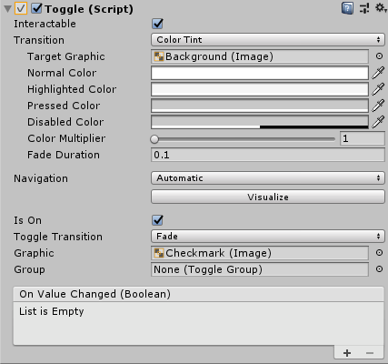 - On Value Changed() 토글이 선택된 경우 토글의 현재 상태를 전달하는 이벤트