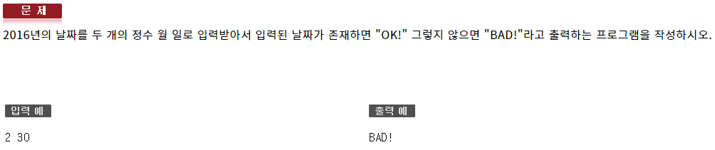 #include <iostream> using namespace std; bool IsValidDate(int m, int d); int main(void) { int m, d; cin >> m >> d; if (IsValidDate(m, d)) cout << "OK!" << endl; else cout << "BAD!" << endl; } bool IsValidDate(int m, int d) { static int arr[13]{ 0, 31, 29, 31, 30, 31, 30, 31, 31, 30, 31, 30, 31 }; if (m > 12) return false; if (m < 1) return false; if (d > arr[m]) return false; if (d < 1) return false; return true; }581 : 함수2 - 자가진단3