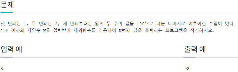 #include <iostream> using namespace std; void RecursiveFunc(int n, int pre, int cur, int stage); int main(void) { int n; cin >> n; RecursiveFunc(n, 1, 2, 2); } void RecursiveFunc(int n, int pre, int cur, int stage) { if (stage == n) { cout << cur << endl; return; } RecursiveFunc(n, cur, pre * cur % 100, stage + 1); }235 : 함수3 - 형성평가5
