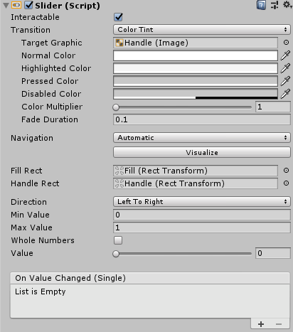- On Value Changed() 슬라이더의 현재 값이 변경되는 경우 현재 값을 float 타입 인자로 전달하는 이벤트