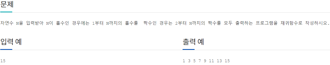 #include <iostream> using namespace std; void RecursiveFunc(int n); int main(void) { int n; cin >> n; RecursiveFunc(n); cout << endl; } void RecursiveFunc(int n) { if (n <= 0) return; RecursiveFunc(n - 2); cout << n << ' '; }