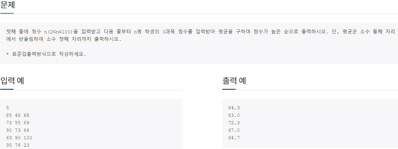 #include <iostream> using namespace std; int main() { int n; cin >> n; float* arr = new float[n]; int a, b, c; for (int i = 0; i < n; ++i) { cin >> a >> b >> c; arr[i] = (a + b + c) / 3.0f; } for (int i = 0; i < n; ++i) { for (int j = 0; j < n - 1 - i; ++j) { if (arr[j] < arr[j + 1]) swap(arr[j], arr[j + 1]); } } cout.setf(ios::fixed); cout.precision(1); for (int i = 0; i < n; ++i) { cout << arr[i] << endl; } delete[] arr; }213 : 파일입출력 - 형성평가9