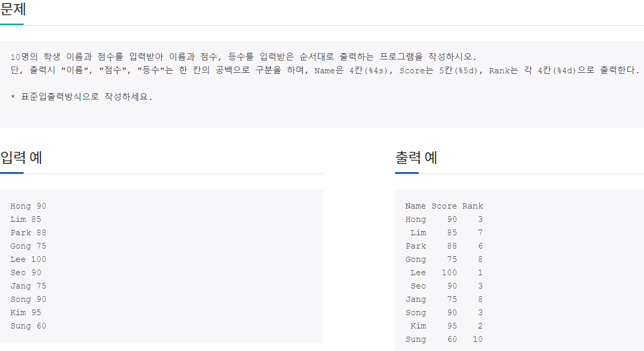 #include <iostream> #include <iomanip> #include <string> using namespace std; struct Student { string name; int score; int rank; int orig; }; int main() { Student arr[10]; for (int i = 0; i < 10; ++i) { cin >> arr[i].name >> arr[i].score; arr[i].orig = i; } for (int i = 0; i < 10; ++i) { for (int j = 0; j < 9 - i; ++j) { if (arr[j].score < arr[j + 1].score) { swap(arr[j], arr[j + 1]); } } } int preScore = -999; int preRank = 1; for (int i = 0; i < 10; ++i) { if (preScore == arr[i].score) { arr[i].rank = preRank; } else { arr[i].rank = i + 1; } preScore = arr[i].score; preRank = arr[i].rank; } cout.setf(ios::right); cout << "Name Score Rank\n"; for (int i = 0; i < 10; ++i) { for (int j = 0; j < 10; ++j) { if (arr[j].orig == i) { cout << setw(4) << arr[j].name << ' ' << setw(5) << arr[j].score << ' ' << setw(4) << arr[j].rank << endl; break; } } } }629 : 파일입출력 - 자가진단4