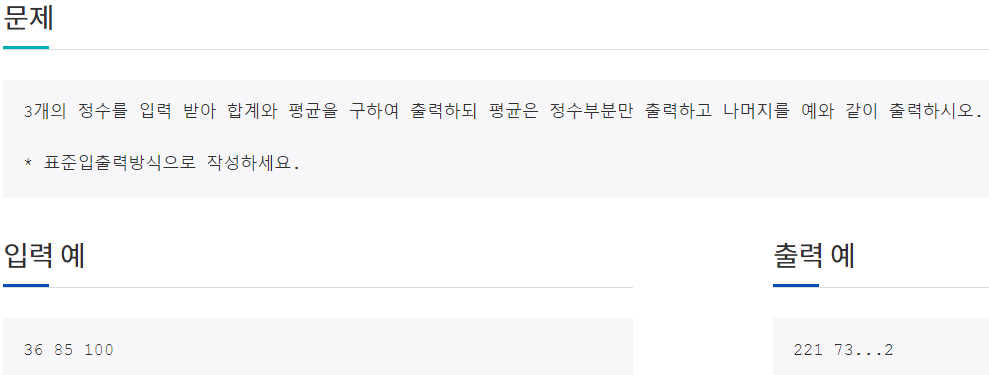 #include <iostream> using namespace std; int main() { int a, b, c; cin >> a >> b >> c; int sum = a + b + c; int avg = sum / 3; int res = sum % 3; cout << sum << ' ' << avg << "..." << res << endl; }207 : 파일입출력 - 형성평가3
