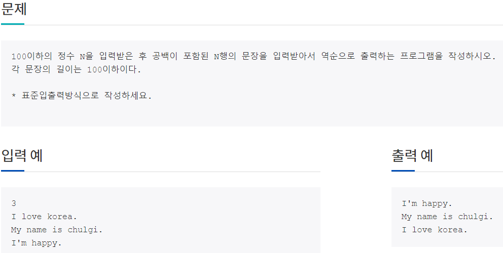 #include <iostream> #include <vector> #include <string> using namespace std; int main() { int n; cin >> n; vector<string> strArr; strArr.reserve(n); cin.clear(); cin.ignore(9999999, '\n'); string temp; for (int i = 0; i < n; ++i) { getline(cin, temp); strArr.emplace_back(temp); } for (int i = n - 1; i >= 0; --i) { cout << strArr[i] << endl; } }631 : 파일입출력 - 자가진단6