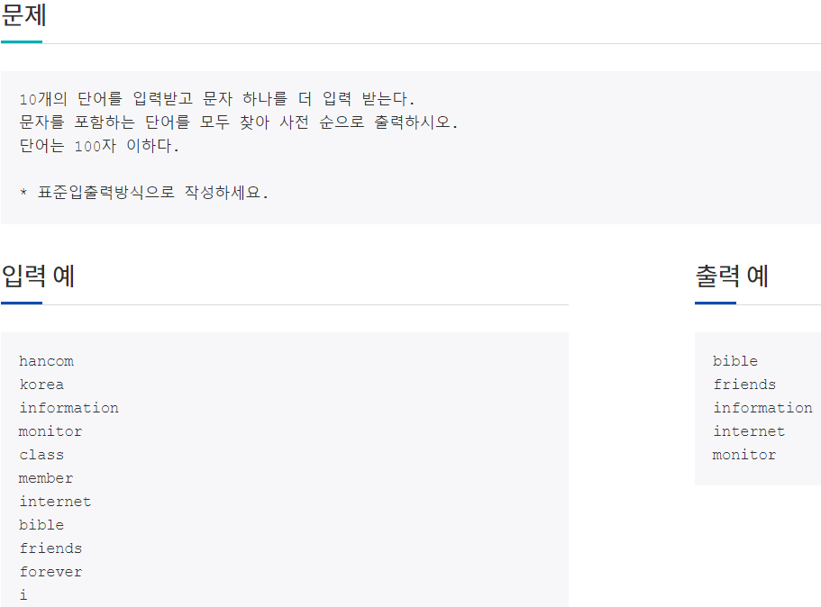 #include <iostream> #include <string> using namespace std; int main() { string strArr[10]; for (int i = 0; i < 10; ++i) { cin >> strArr[i]; } for (int i = 0; i < 10; ++i) { for (int j = 0; j < 9 - i; ++j) { if (strArr[j] > strArr[j + 1]) { swap(strArr[j], strArr[j + 1]); } } } char c; cin >> c; for (int i = 0; i < 10; ++i) { if (strArr[i].find(c) != -1) { cout << strArr[i] << endl; } } }http://www.jungol.co.kr/bbs/board.php?bo_table=pbank&sca=10i0