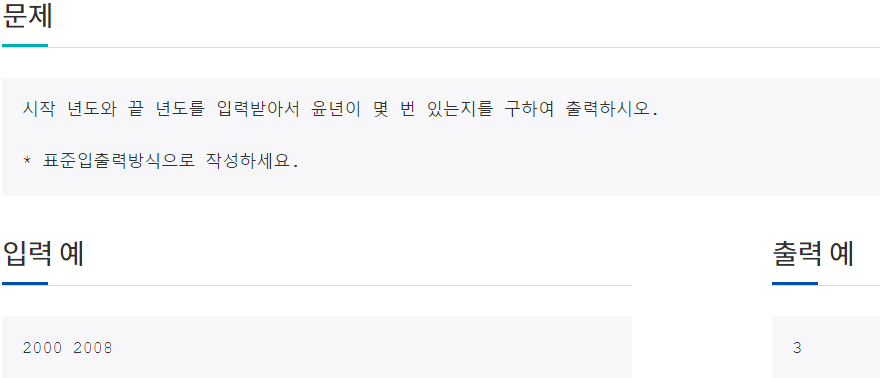 #include <iostream> using namespace std; bool IsYoon(int year); int main() { int beg, end; cin >> beg >> end; int count = 0; while (beg <= end) { if (IsYoon(beg++)) { count++; } } cout << count << endl; } bool IsYoon(int year) { if (year % 400 == 0) return true; if (year % 100 == 0) return false; if (year % 4 == 0) return true; return false; }212 : 파일입출력 - 형성평가8