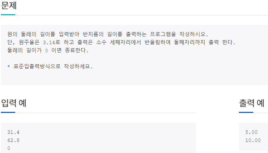 #include <iostream> #include <cmath> using namespace std; const float PI = 3.14; float GetRadius(float var); int main() { float var; cout.setf(ios::fixed); cout.precision(2); while (true) { cin >> var; if (var == 0) break; cout << GetRadius(var) << endl; } } float GetRadius(float var) { return var / (2 * PI); }205 : 파일입출력 - 형성평가1