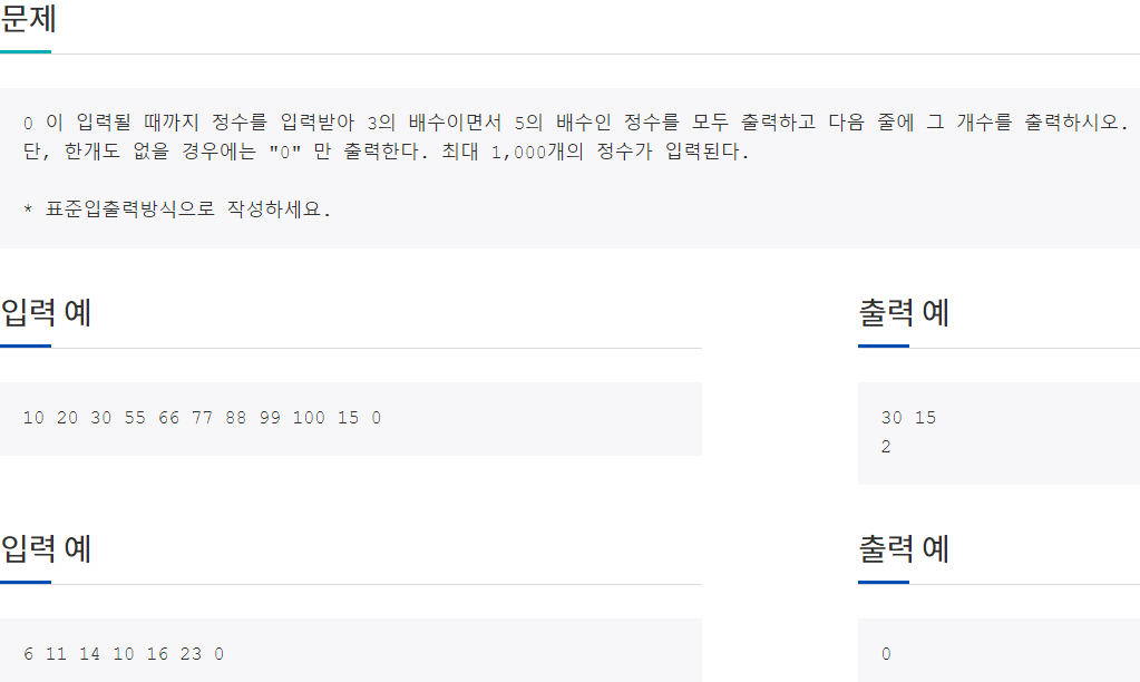 #include <iostream> #include <list> using namespace std; int main() { list<int> resultList; int n; while (true) { cin >> n; if (n == 0) break; if(n % 15 == 0) resultList.push_back(n); } if (resultList.size() > 0) { for (int var : resultList) { cout << var << ' '; } cout << endl; } cout << resultList.size() << endl; }210 : 파일입출력 - 형성평가6