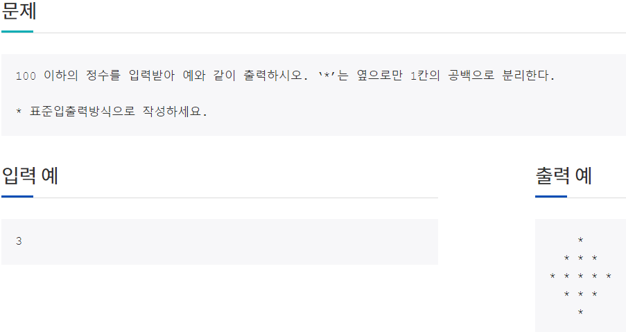 #include <iostream> using namespace std; int main() { int n; cin >> n; for (int i = 0; i < n; ++i) { for (int j = 0; j < n - 1 - i; ++j) { cout << " "; } for (int j = 0; j < 2 * i + 1; ++j) { cout << "* "; } cout << endl; } for (int i = n - 2; i >=0; --i) { for (int j = 0; j < n - 1 - i; ++j) { cout << " "; } for (int j = 0; j < 2 * i + 1; ++j) { cout << "* "; } cout << endl; } }211 : 파일입출력 - 형성평가7